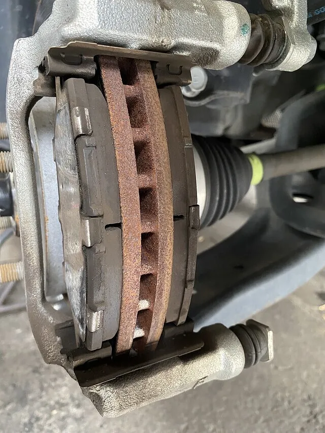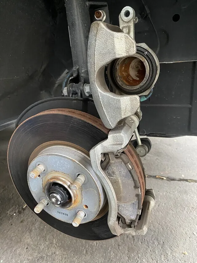 フロントブレーキのキャリパーを外して、ブレーキピストンからのオイル漏れが無いかの確認とブレーキパッドの残量を点検します。