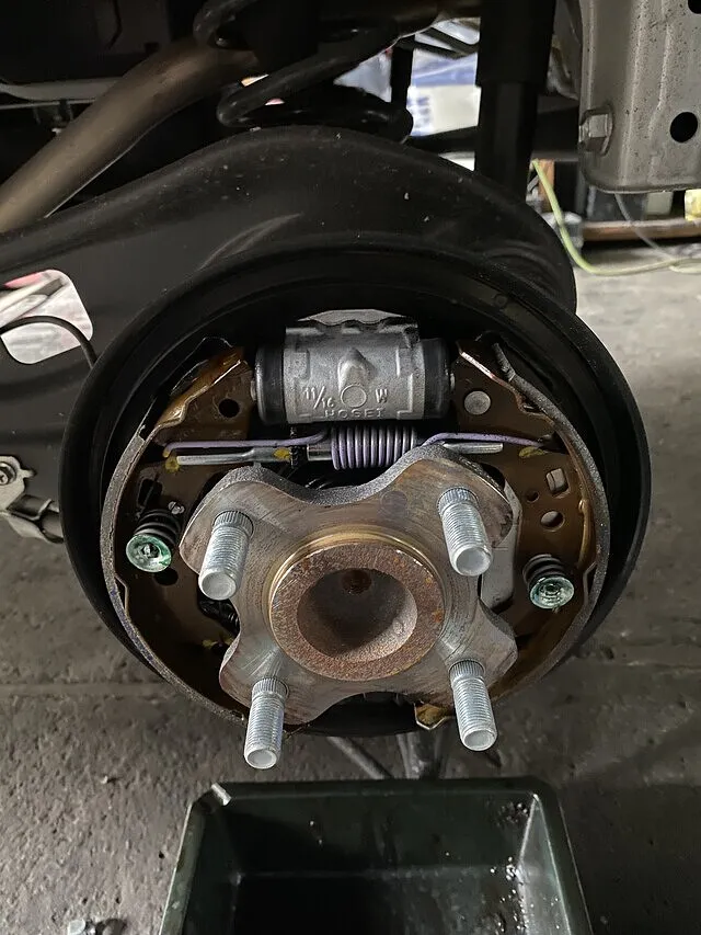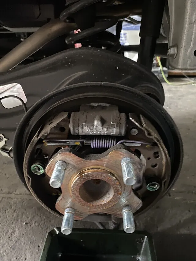ホイールシリンダーからのオイル漏れが無いか、ブレーキシューの残量の確認をして清掃、グリスを塗布して組み付けます。